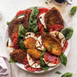 This crispy chicken caprese is a delicious summer meal! Tender, thin and crispy chicken cutlets layered with heirloom tomatoes, fresh mozzarella cheese and basil. Drizzle it with a balsamic glaze for the ultimate flavor bomb!