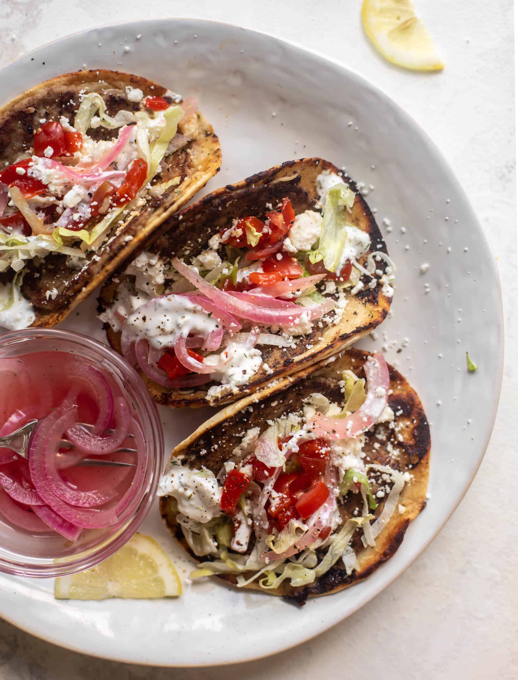 We love this spin on the viral tiktok smash burger tacos! These turkey smash burger tacos have a mediterranean twist with a yogurt feta sauce, lots of dill, pickled onions and roasted red peppers. They are super delicious and come together quickly!