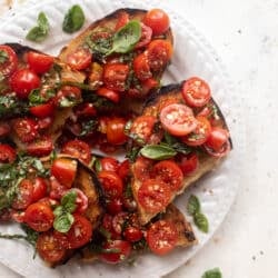 Welcome to the side dish I make multiple times a week every single summer. Grilled bread, the most delicious and insanely garlicky tomatoes with fresh basil and balsamic spooned on topβ¦ HEAVEN.Β