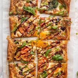 We adore this caprese puff pastry! Flaky puff pastry is layered with fresh basil pesto, juicy ripe tomatoes, fresh mozzarella cheese and a balsamic glaze. It’s a lovely weeknight meal or the perfect summer appetizer!