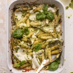This baked pesto pasta is an incredibly easy side dish that goes with just about anything. A few ingredients come together to make this herby, cheesy pasta an absolute delight that everyone loves.