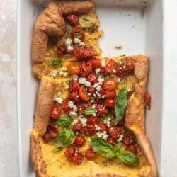 A sweet dutch baby tends to be drizzled with maple syrup. I don’t drizzle anything on this one (though you could use a balsamic glaze!) because the tomatoes are very juicy and the cheese melty. It all comes together beautifully and doesn’t really need a dressing or condiment to go with it.