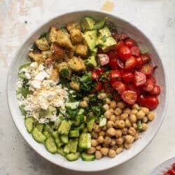 This is my favorite chickpea salad bowl! Loaded with arugula greens, crunchy dill croutons, chickpeas, feta, avocado, cucumbers and tomatoes, this salad tossed in a red wine vinaigrette is a satisfying meal that everyone will love.