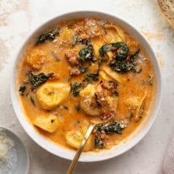 Today’s soup is filled with butternut squash, sweet italian sausage and kale! I’ve also made this fire roasted tortellini soup with chicken before, and also a vegetarian version with white beans!