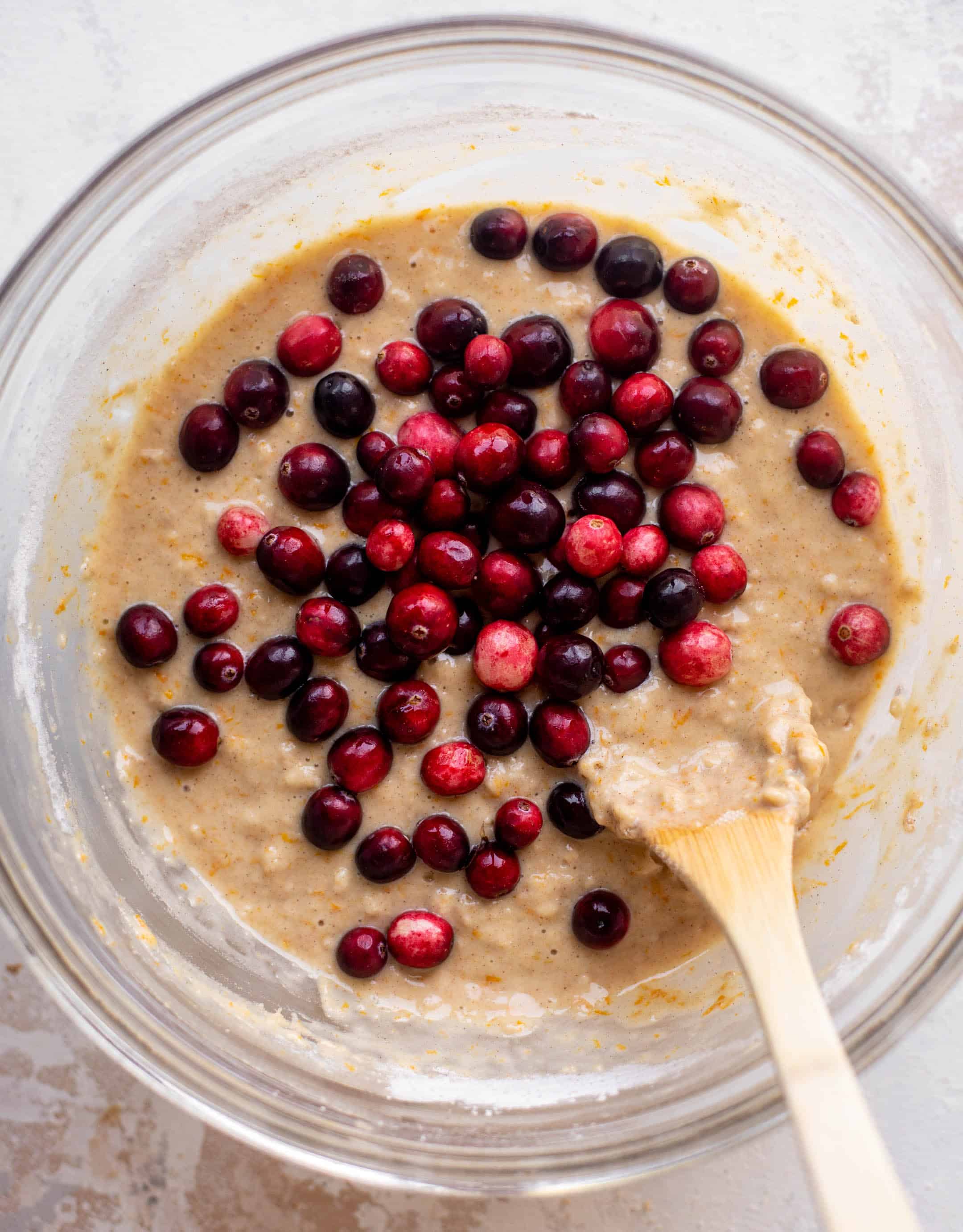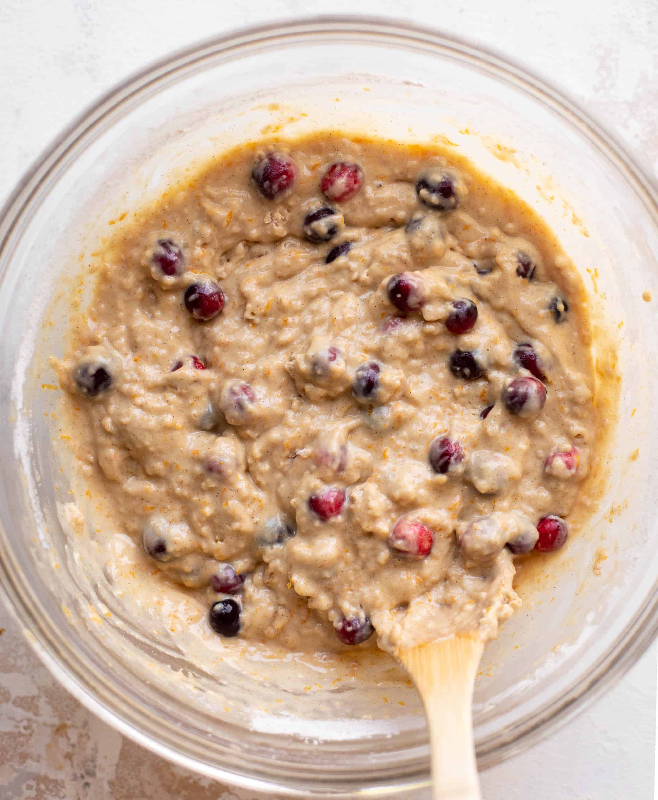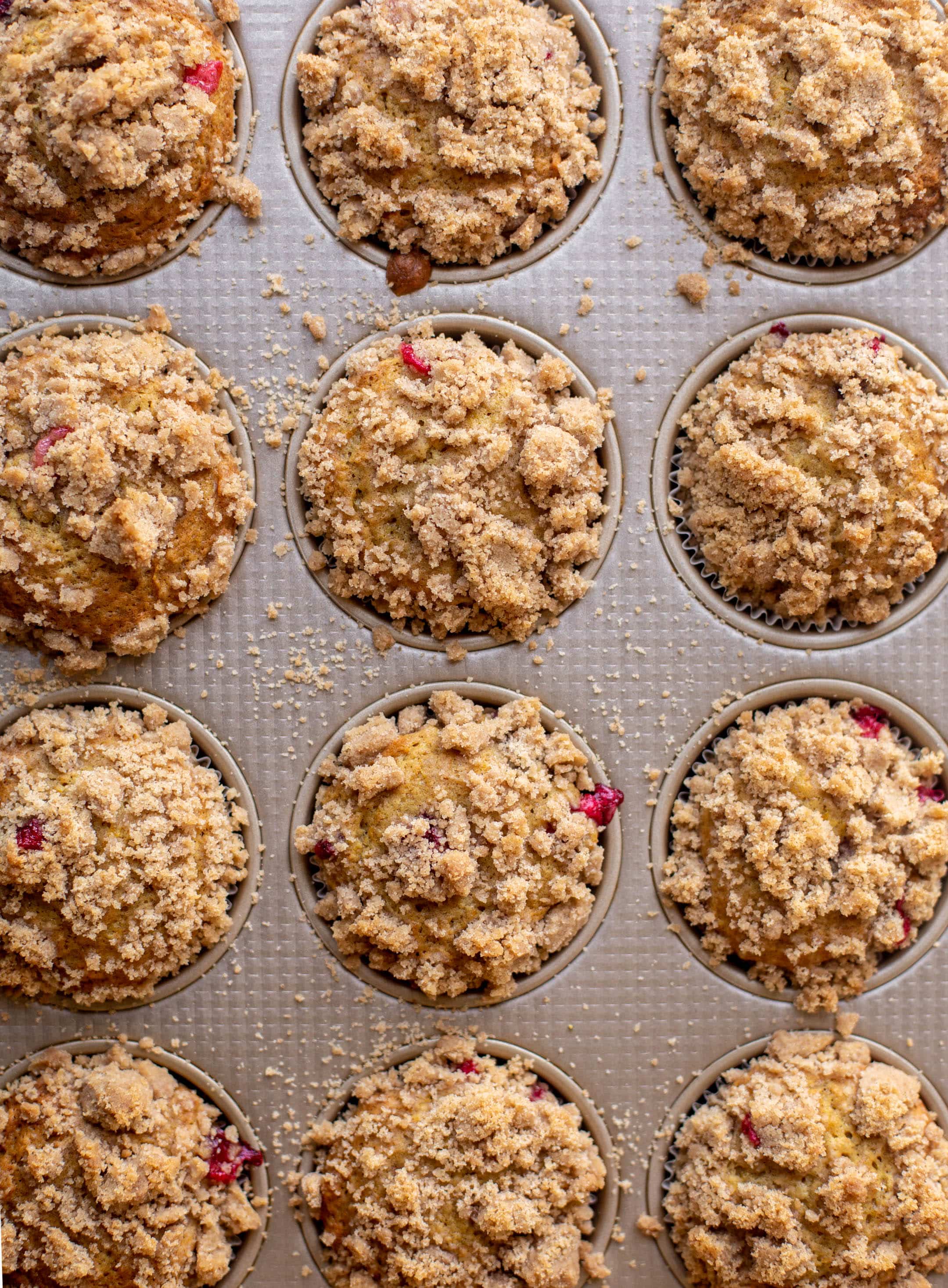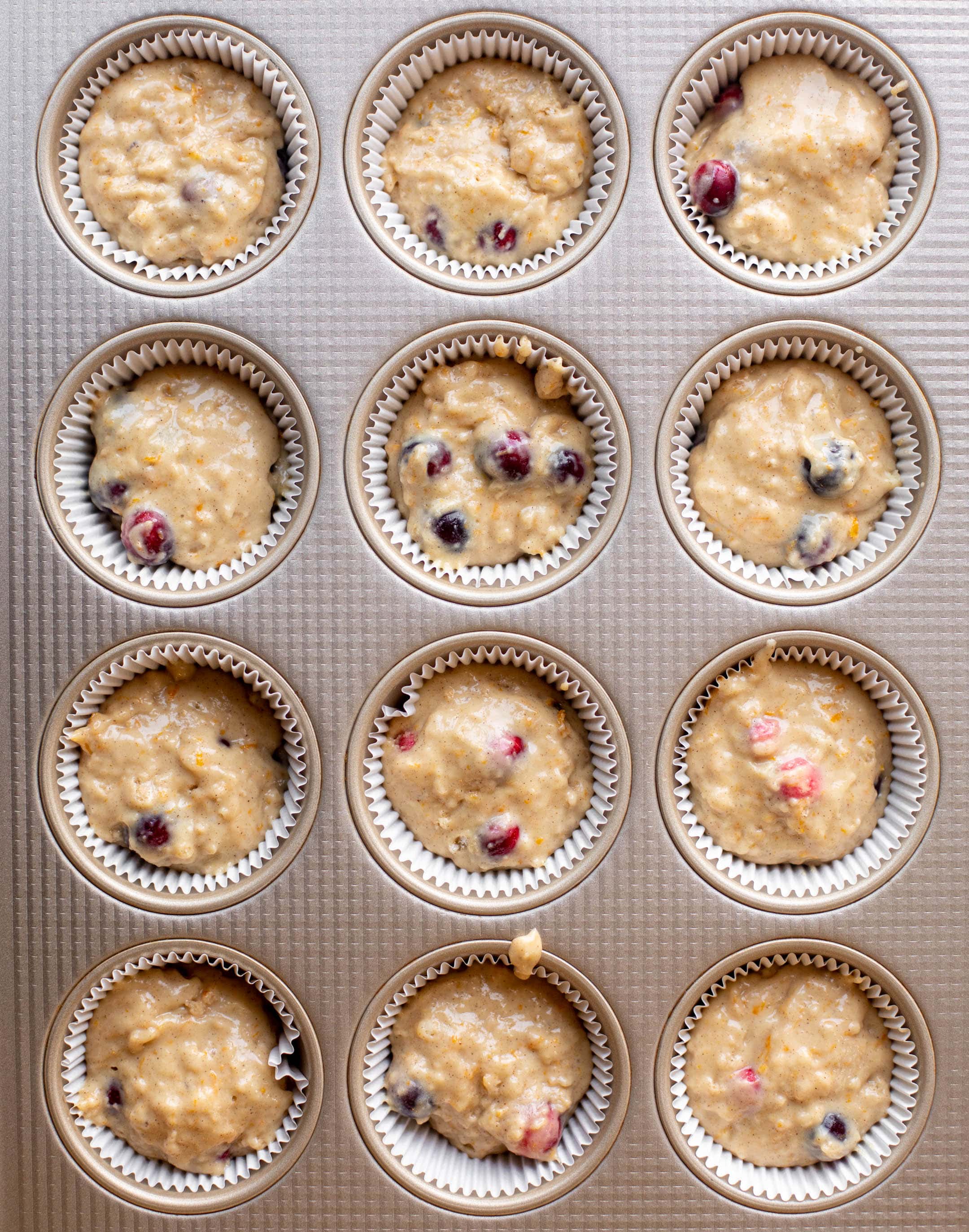 - Add the dry ingredients to the wet, mixing until just combined. Stir in the orange zest and cranberries. Fill the muffin liners about ⅔ of the way full. Sprinkle the streusel on top of the batter, pressing gently so it sticks to the batter.