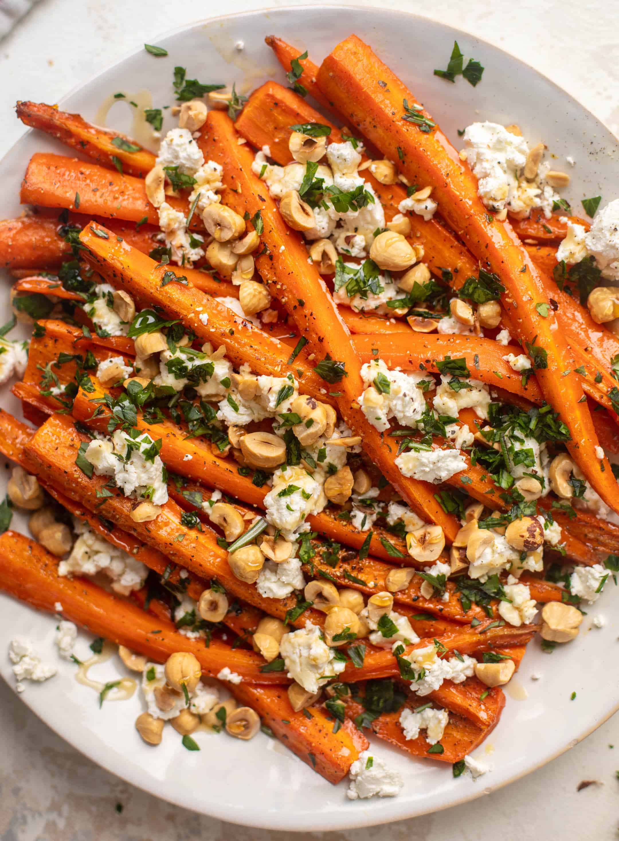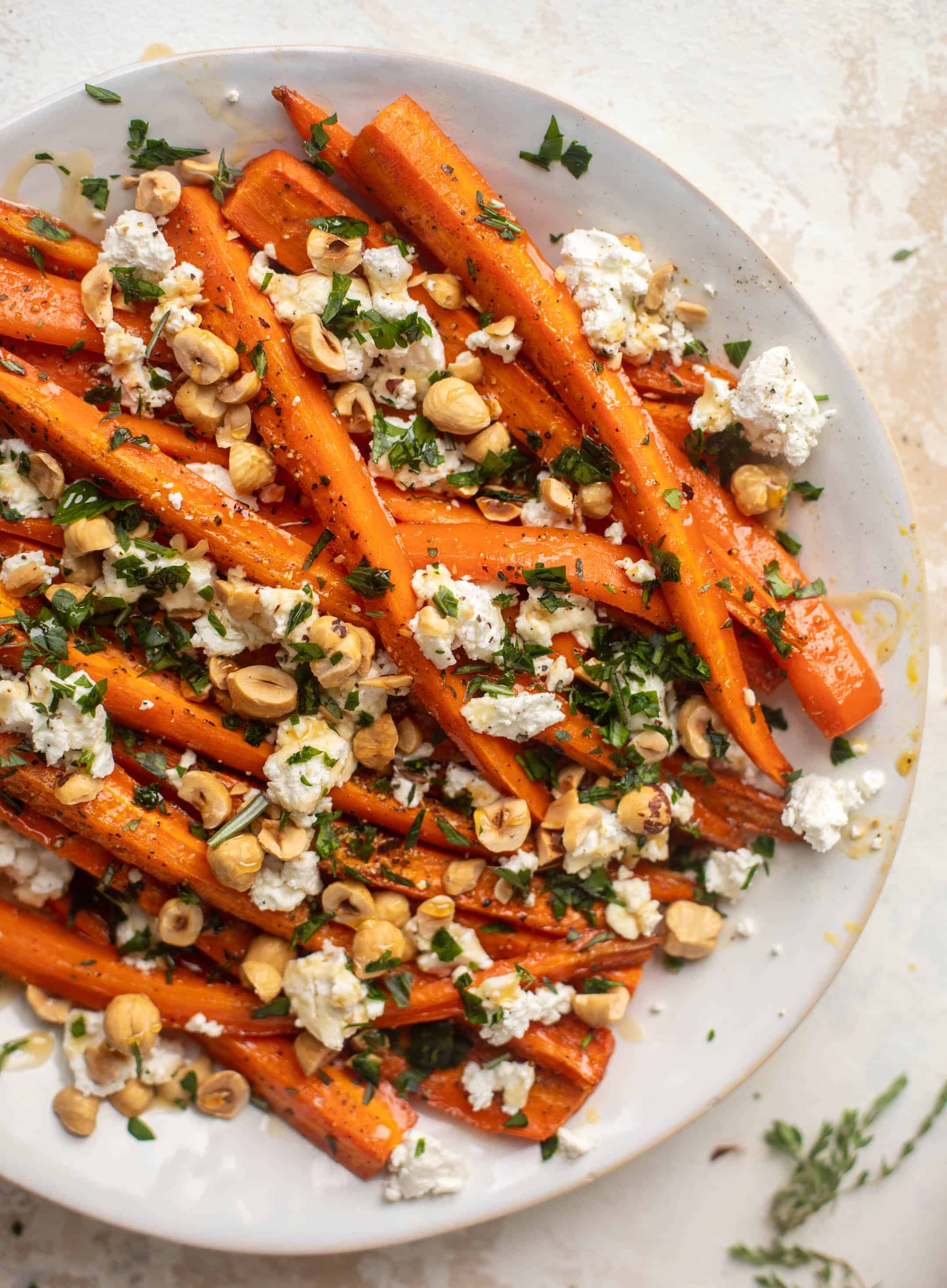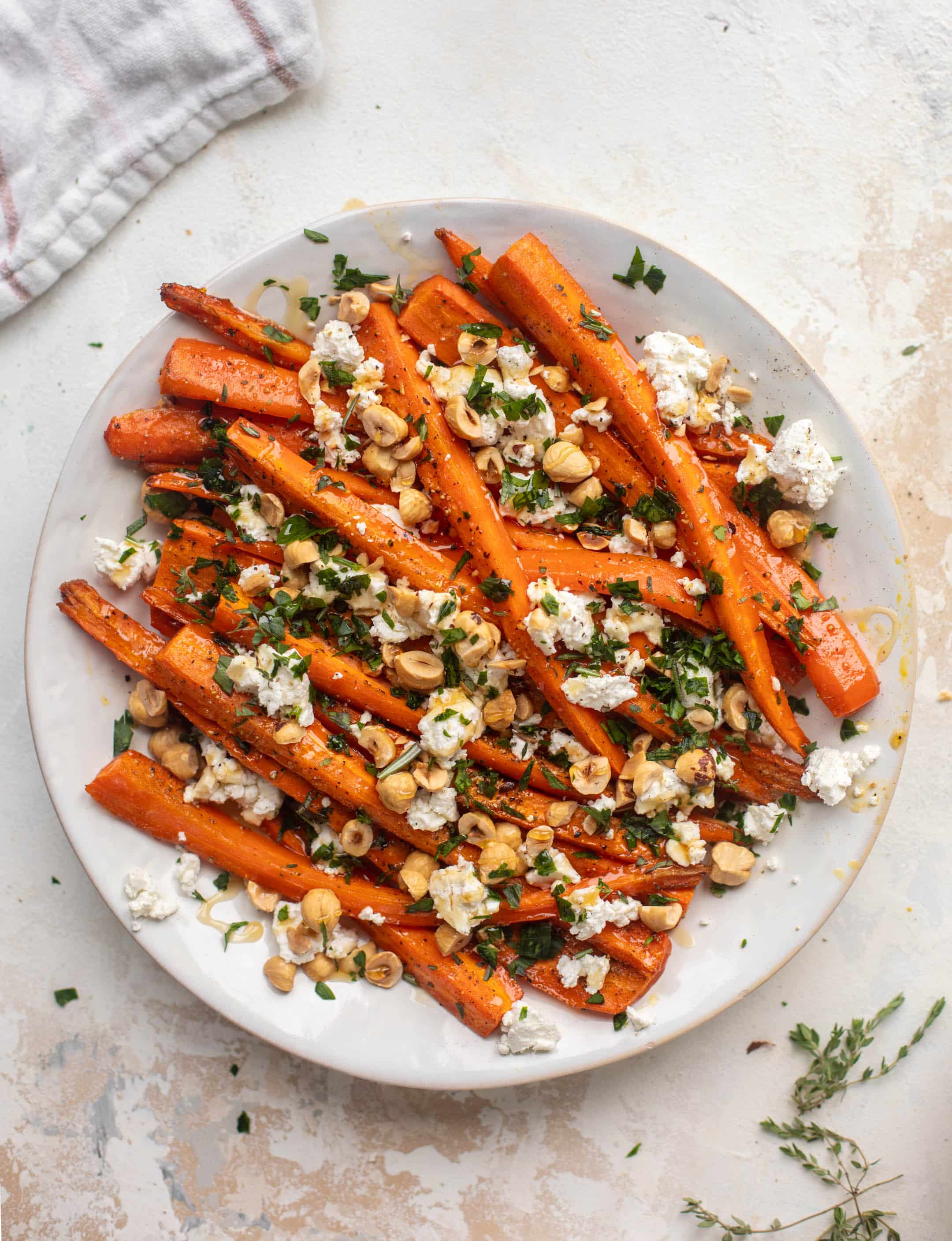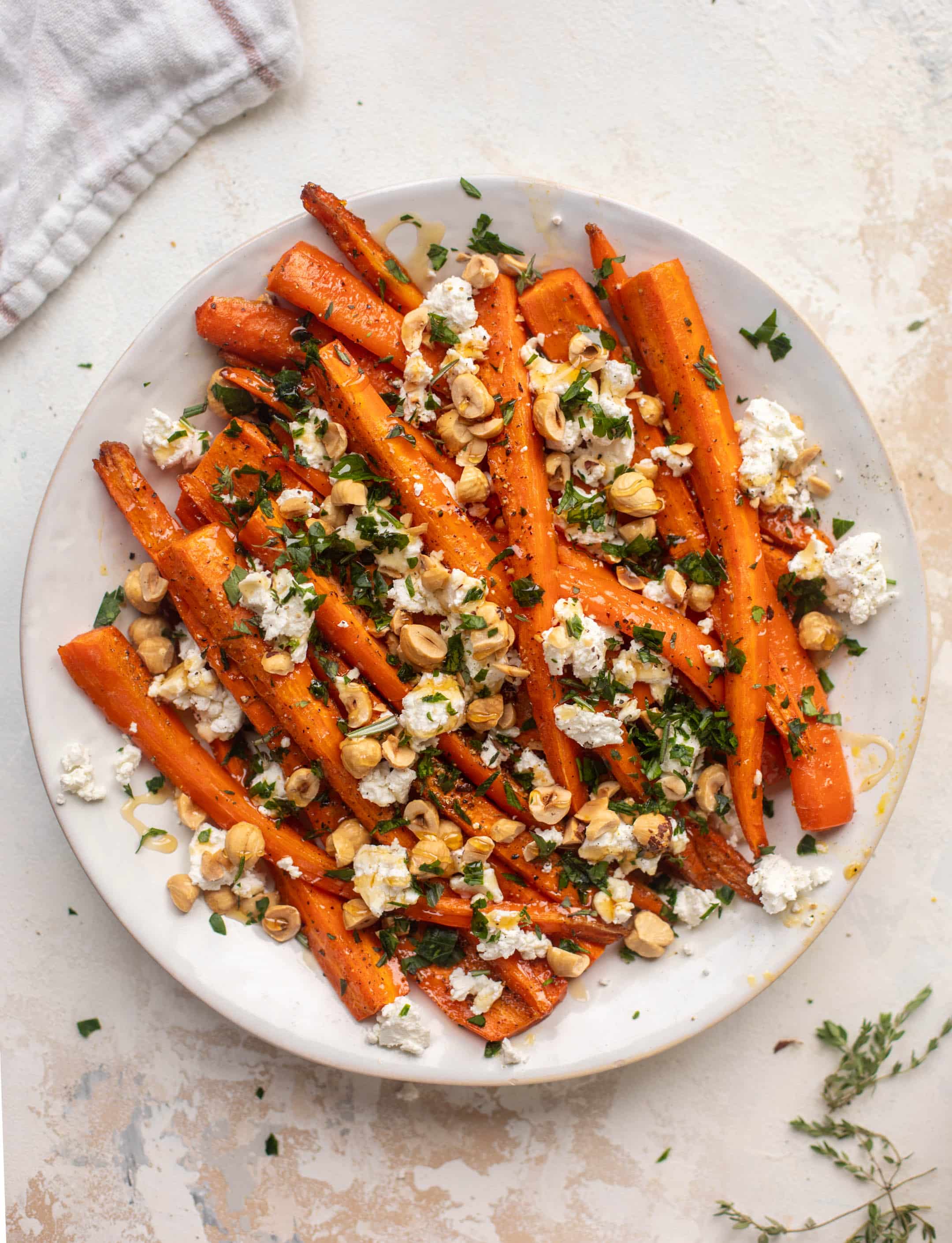 Maple roasted carrots are the most delicious side dish! Topped with creamy goat cheese, crunchy toasted hazelnuts and bright, fresh herbs, this dish is flavorful and simple!