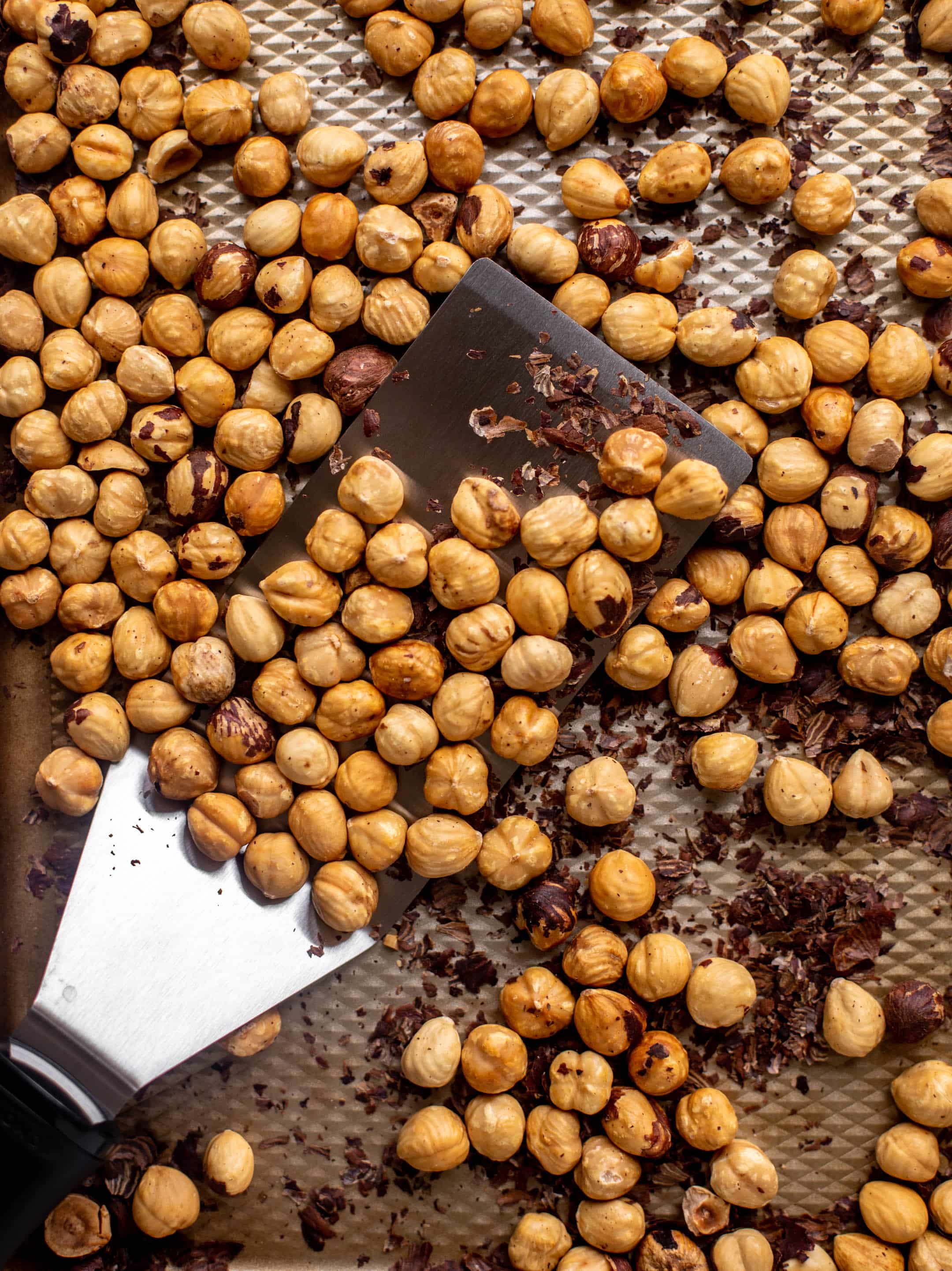 - Toast the hazelnuts while the carrots roast, if needed. I place the hazelnuts in a skillet over medium heat and toast for 5 to 10 minutes, or until fragrant, stirring mostly the whole time. Then I transfer them to a baking sheet and rub a towel over them to remove their outside papery skin.
