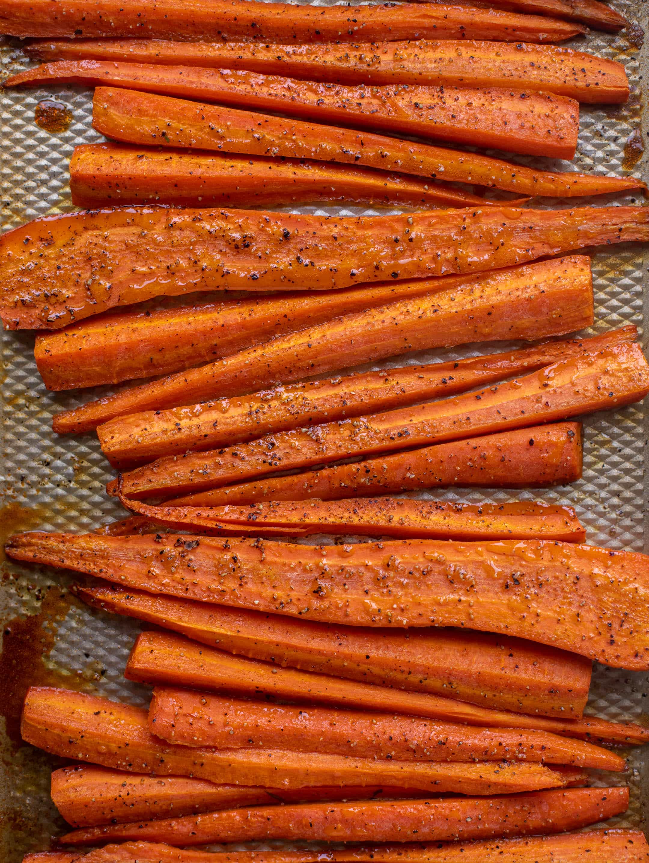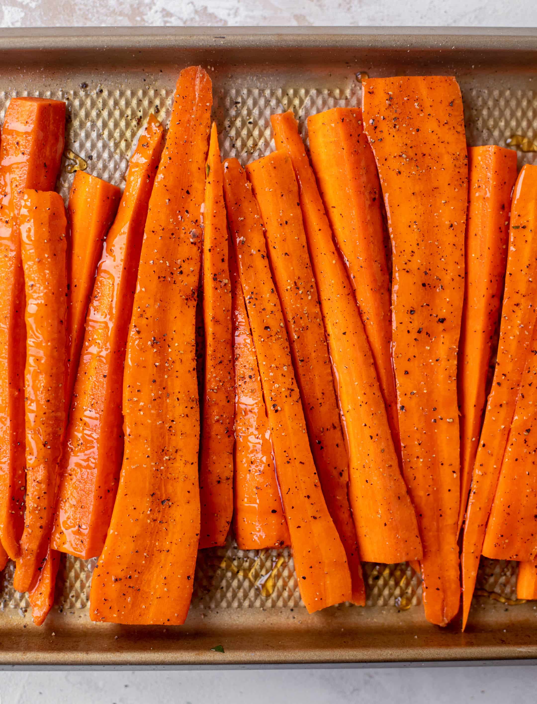 - Peel the carrots. If they are larger, you can slice them in half lengthwise. Or you can leave them whole! Place the carrots on a baking sheet. Drizzle with the maple syrup, olive oil and a big pinch of salt and pepper.