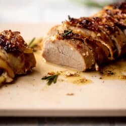 I love the flavor combination of this recipe. It’s simple, yet delicious every time. I choose to grill mine over indirect heat, still at the 425. I think by grilling the bacon tends to crisp a little better. Towards the end of the cook I turn all burners on to crisp the bacon even more. I have done it this way 5 or 6 times and always delicious.