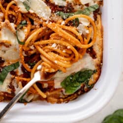 I’m pretty sure the best part of the baked spaghetti is the melty cheese. I also love how some parts of the noodles peek out from the sauce and end up crunchy and crisp from the oven. I steal those pieces. Of course.