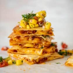These hot honey shrimp quesadillas are savory and delicious, made with lots of melty cheese and served with mango salsa. These are baked in the oven until the tortillas are super crispy. The perfect easy meal!