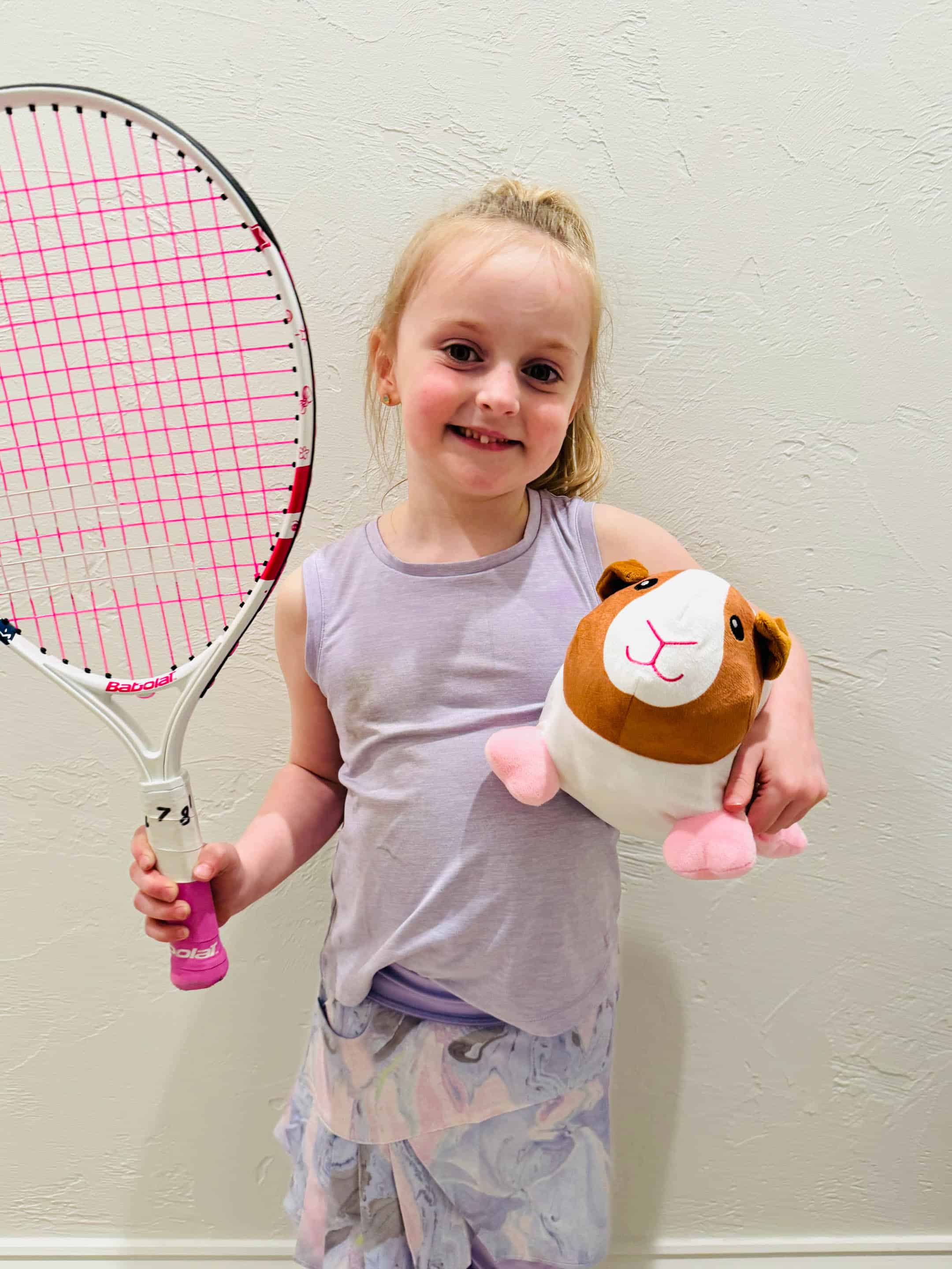 Emilia got to bring home the class “pet” this week – thank goodness it’s not a real one. She took it to tennis.