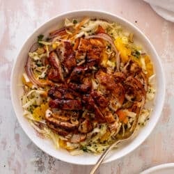 We love this BBQ chicken with citrus slaw! The hot honey BBQ chicken thighs are coated in a sticky, flavorful sauce. The slaw salad is crunchy and refreshing with tons of flavor! Put it together for a lovely weeknight meal!