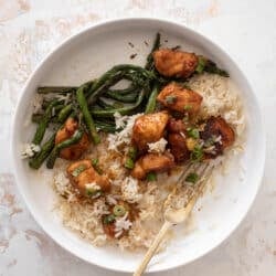 This honey mustard chicken is tender and golden, tossed in a honey mustard glaze and served with roasted asparagus and jasmine rice. It’s so satisfying and comes together in 30 minutes!