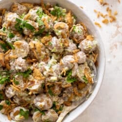 That leaves us here, with this crispy shallot potato salad. If you’re looking for other delish versions of potato salad, I also make a mean smashed potato salad, this potato salad with piccata vinaigrette and even my bacon blue potato salad.