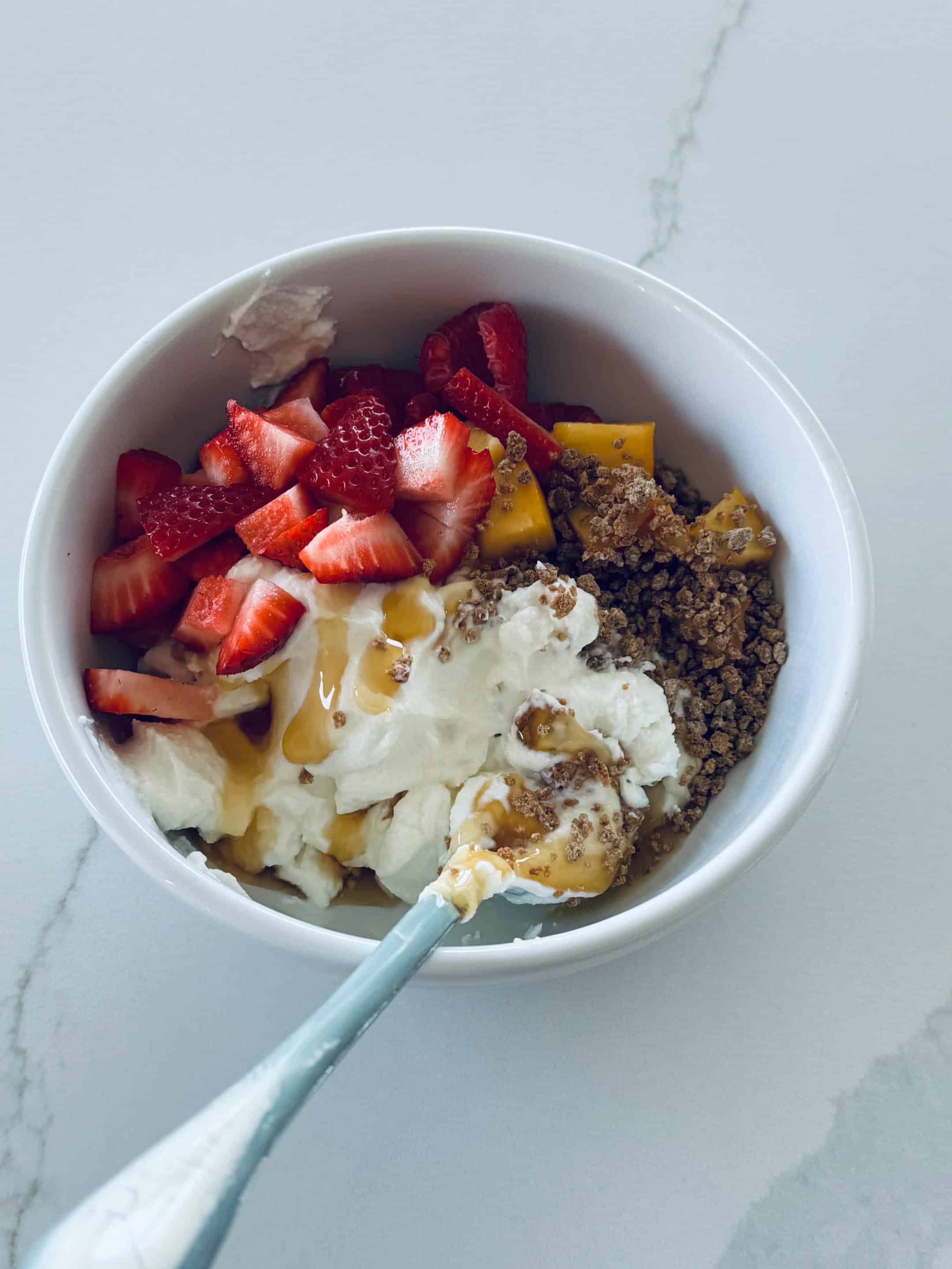 A year later this is still my favorite breakfast. Plain greek yogurt, fruit, grapenuts, honey.