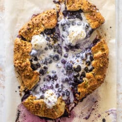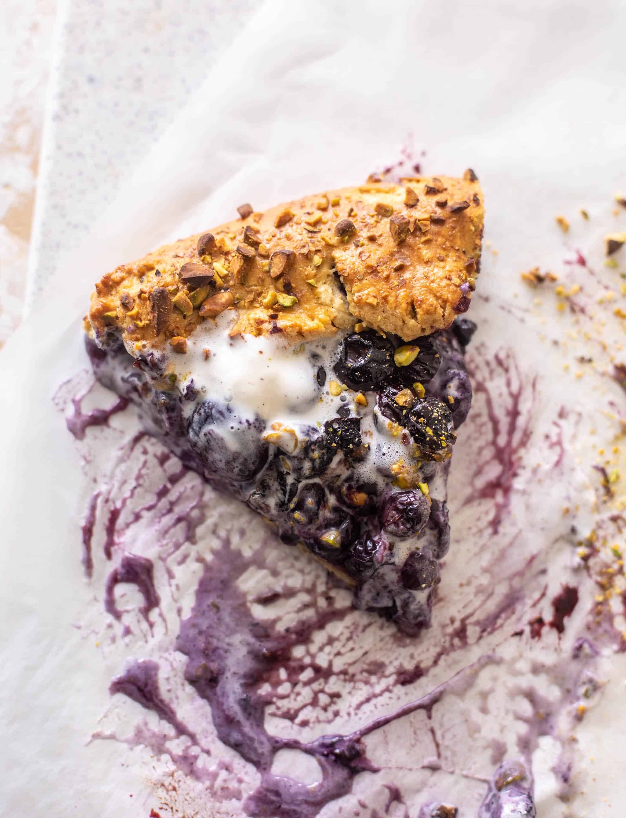 This buttery galette crust is wrapped around juicy blueberries and served with a sprinkling of pistachios, lots of vanilla ice cream and all the summer feels!