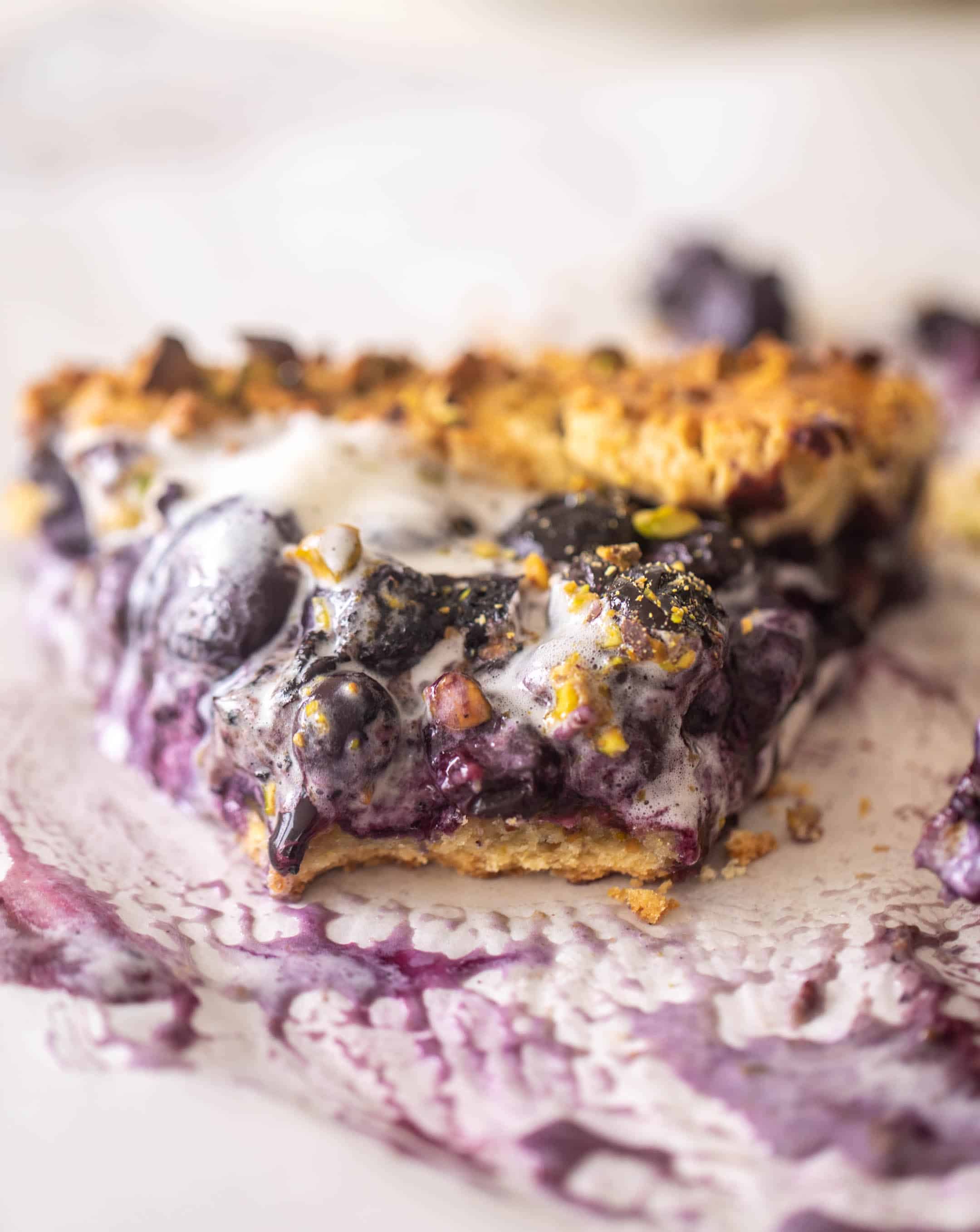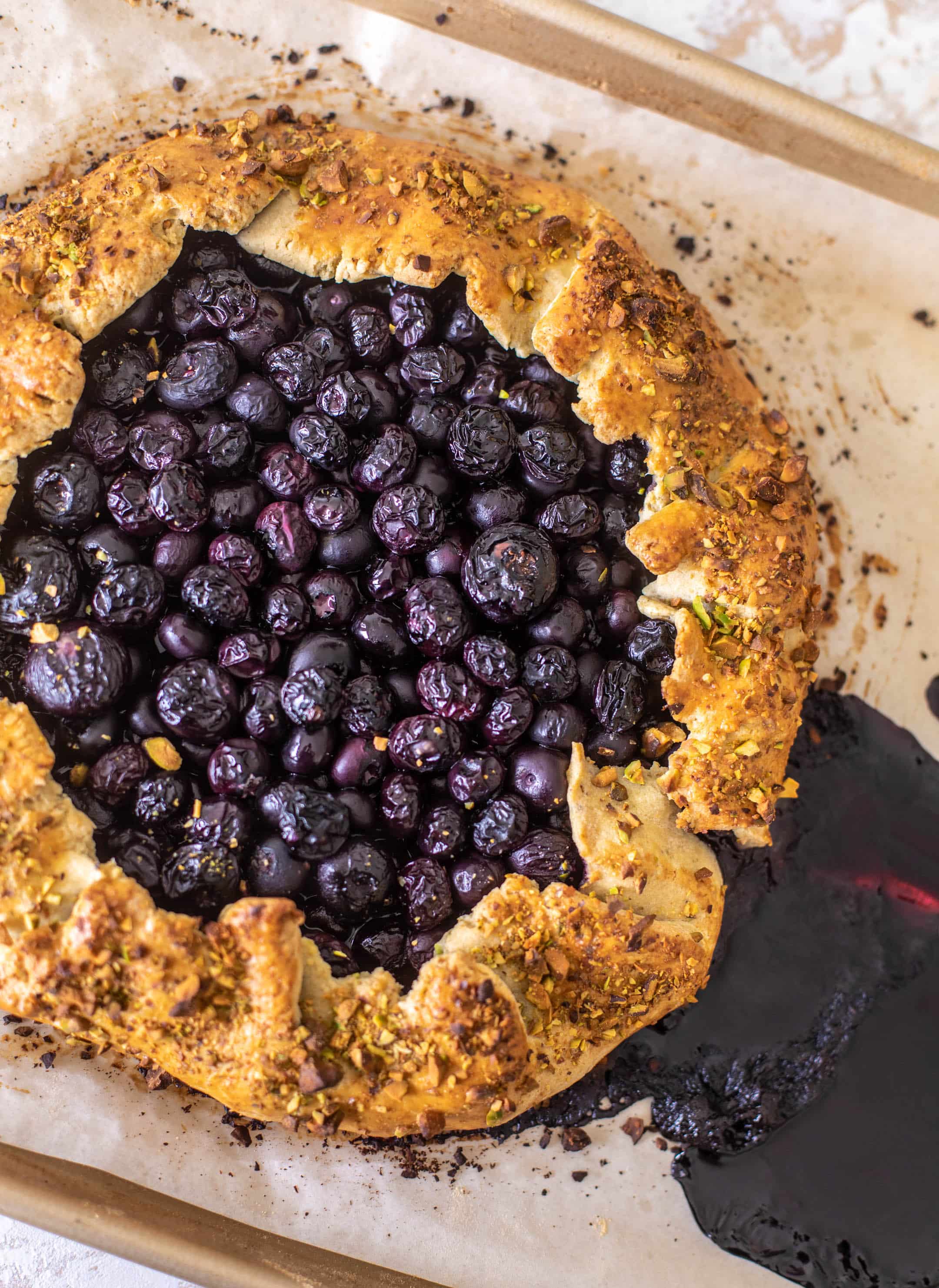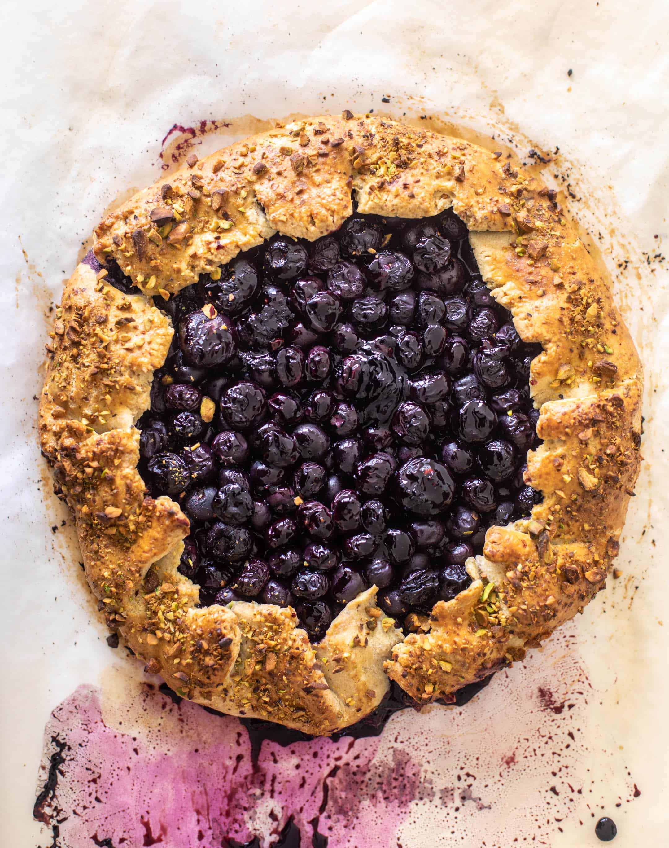 Regularly, I make a blueberry peach galette. That combo will forever be a favorite. But if peaches are out of season, I’ve got you! You can use all blueberries AND make a crust riddled with pistachios.