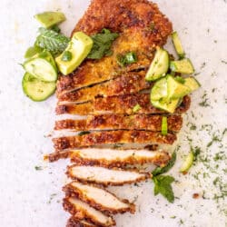 This crispy chicken with avocado cucumber salad is everything! Thin and crispy chicken cutlets, topped with a refreshing cucumber avocado salad with tons of fresh herbs. Add some herb aioli for an extra punch!