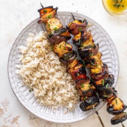 - Remove the skewers from the grill. You can brush with the reserved honey dijon. Serve with the jasmine rice.