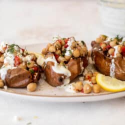 These sweet potatoes are topped with creamy feta sauce, a satisfying chickpea salad with roasted red peppers and then tons of herbs and feta.