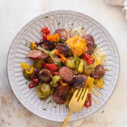 If you’re been around for a while, you might know that Eddie and I say that my smoked sausage sheet pan meals are what I make when I don’t feel like making dinner. My easy-way-out meals. The dish I make when I want to throw everything on a pan and go!