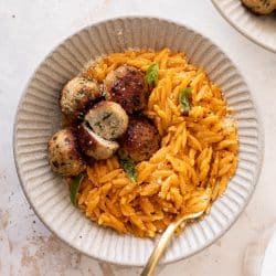 My chicken meatballs with tomato orzo make the ideal meal. Cozy and comforting, the meatballs are tender and juicy served over creamy parmesan tomato orzo pasta. It’s a great weeknight meal that comes together fast.
