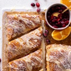 This cranberry orange cheese danish is a dream. The pastry is super flaky and buttery. The filling is creamy and citrusy. And the quick cranberry jam tastes like a holiday flavor explosion.