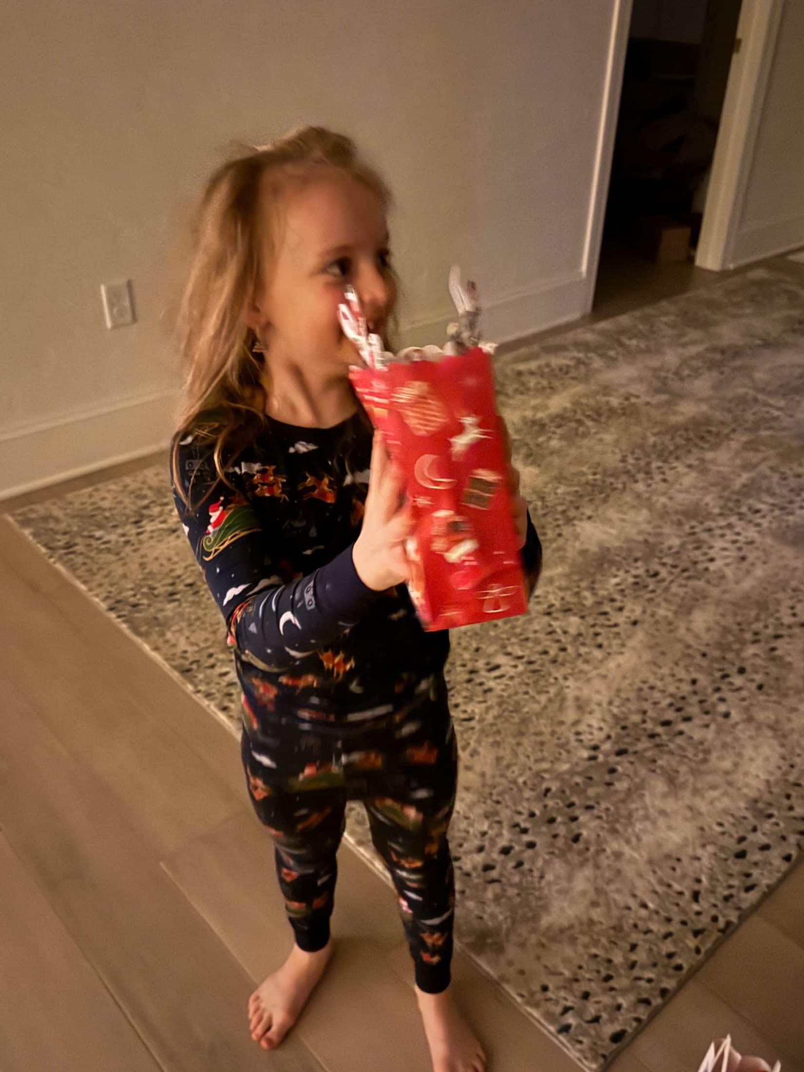 This girl is SO SWEET. The minute she realized it was christmas morning, she ran upstairs and got these bags that she made for everyone. Full of little gifts she found around the house. She was so proud.