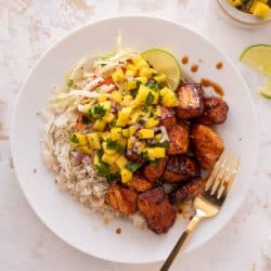 We love these maple chipotle salmon bites! Easy, sticky maple salmon with a kick, served over cabbage slaw, jasmine rice and a refreshing, crisp mango salsa.