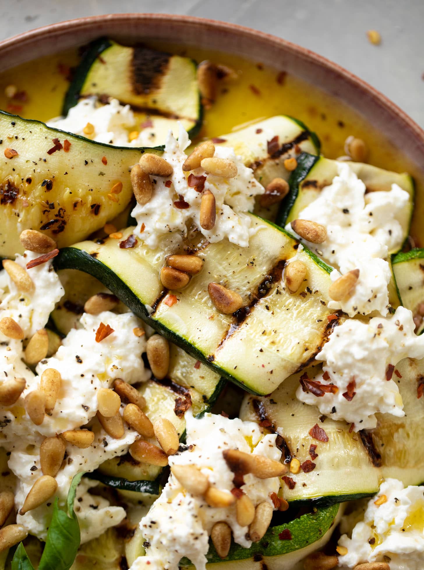 Grilled zucchini with burrata and pine nuts