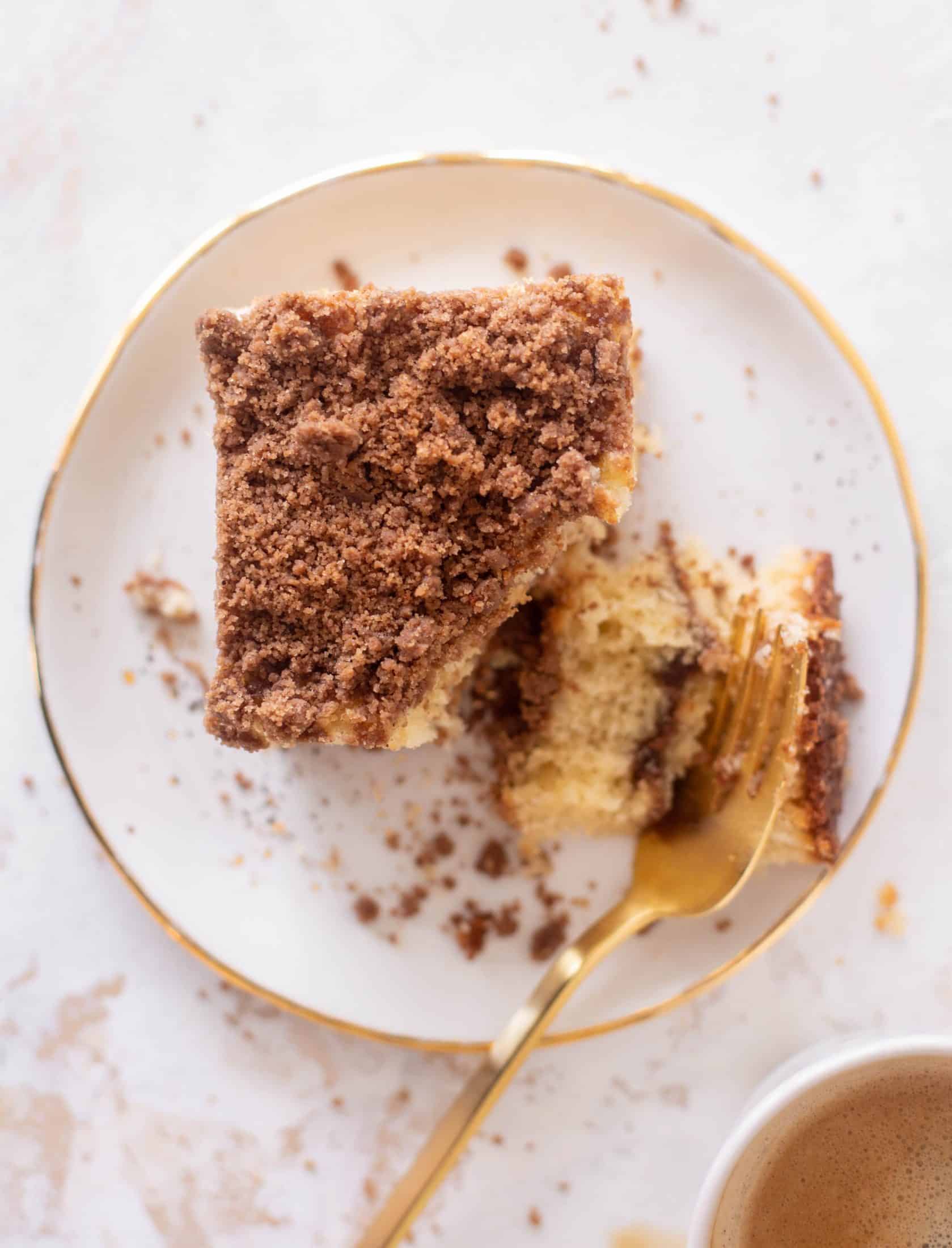 This greek yogurt coffee cake is so tender and filled with the most delicious cinnamony crumb. The texture from the crumb is perfect and the cake is light and fluffy. Everyone loves this cake!