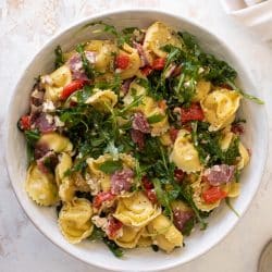This tortellini salad is filled with roasted red peppers, feta cheese, arugula, tortellini and diced shallots. It’s drizzled with my zesty italian dressing which has a zingy bite – it is super flavorful and so satisfying. It’s one of those dishes that you will find yourself craving over and over again!