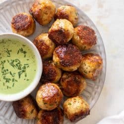 These jalapeno cheddar chicken meatballs are the best! Super easy to make and full of fresh, vibrant flavor, the meatballs are cheesy and seared until golden brown. Dip in an herby summer sauce for the ultimate flavor punch!