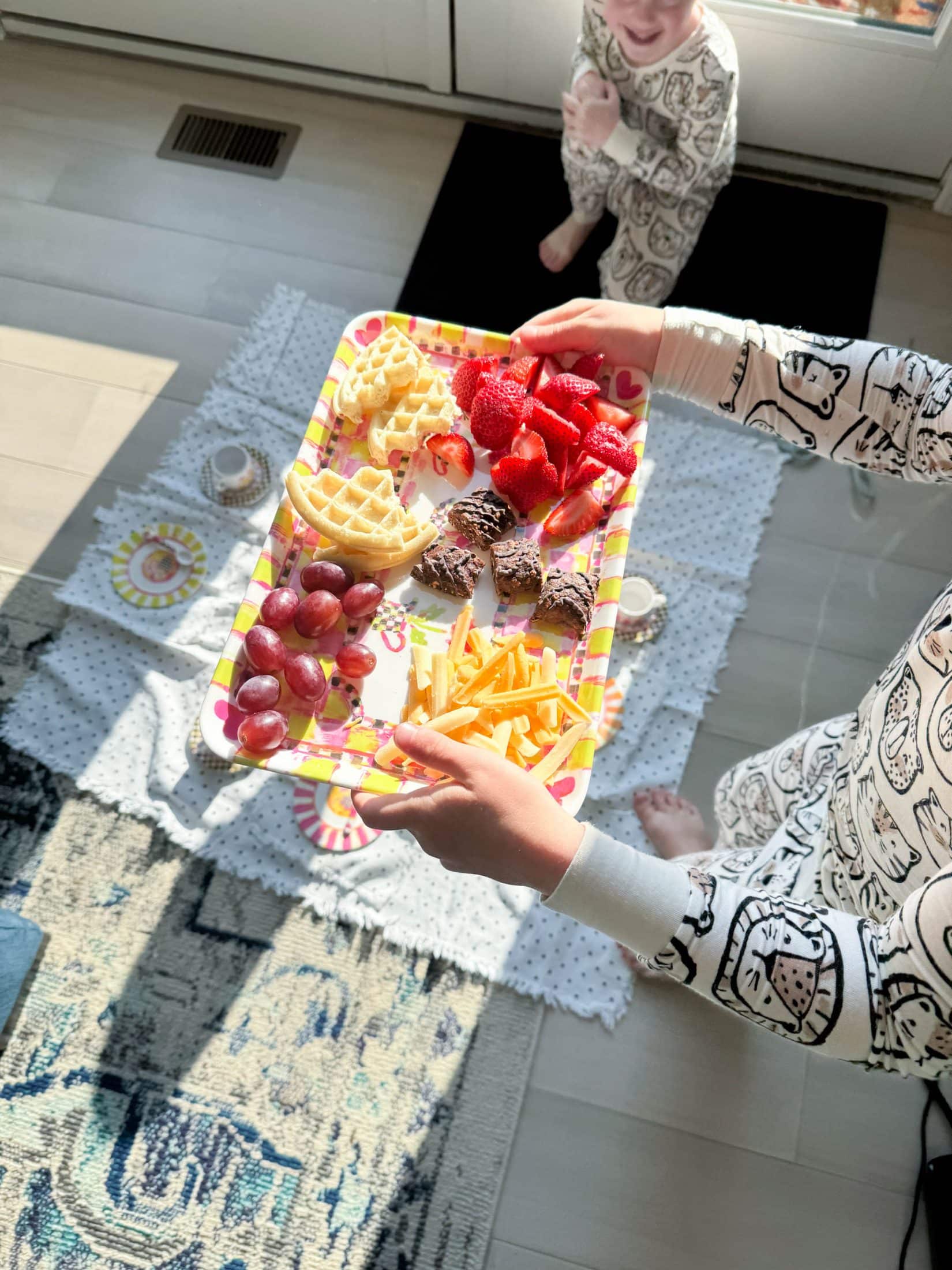 Waffles, cheese, a cut up zbar and strawberries… I love it. Haha.