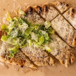 Cacio e pepe pizza is such a fun twist on the original cheese and pepper flavor. Grilled sourdough pizza is brushed with peppery brown butter and topped with pecorino romano. Throw a caesar salad on top and you’re good to go!