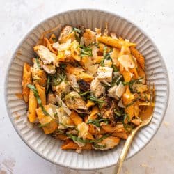 Our whole family adores this grilled chicken vodka pasta! Juicy grilled chicken is tossed with penne that is coated in a super silky vodka sauce. Served with lots of shaved parmesan and fresh basil! This is delicious.
