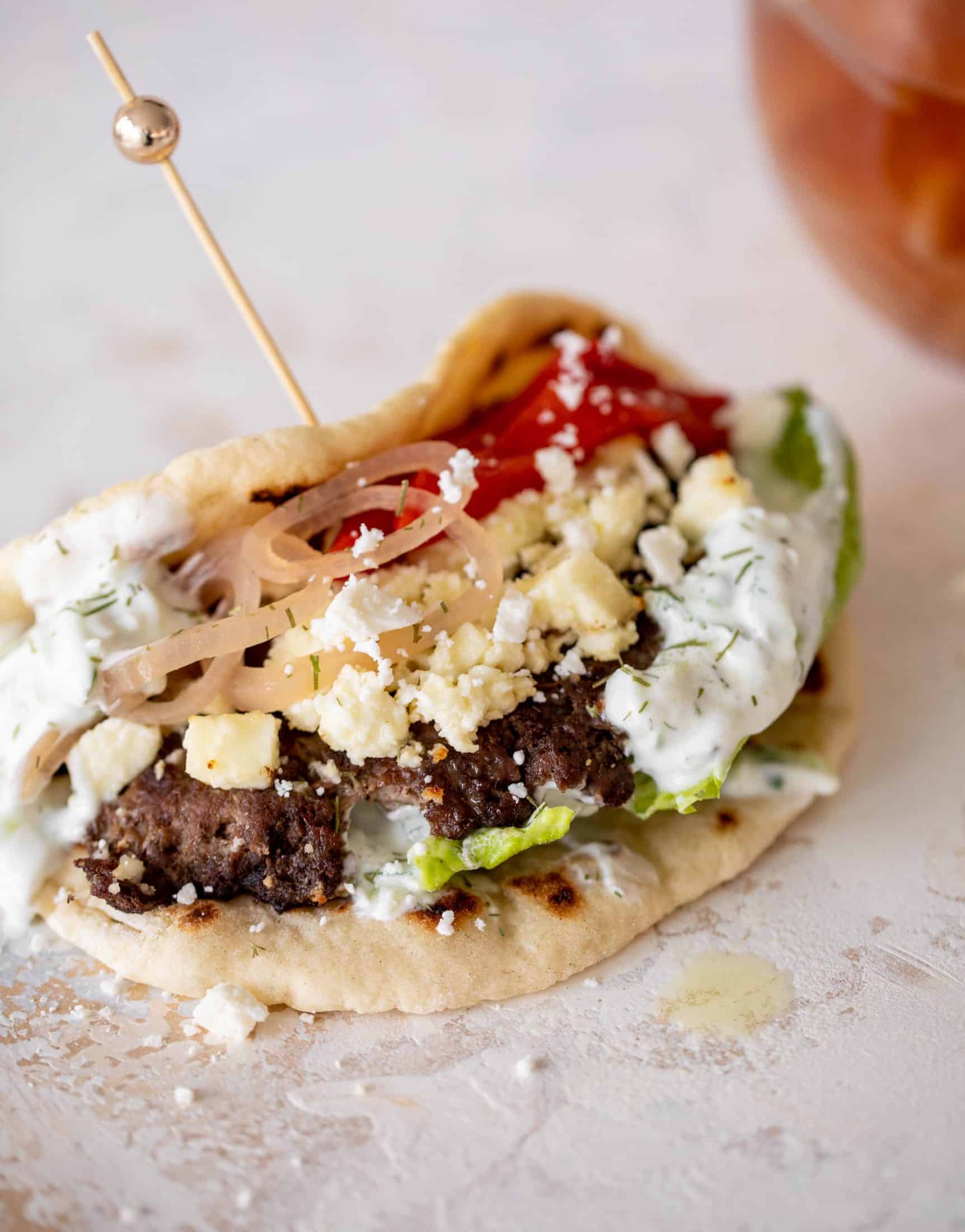 - Heat a cast iron skillet over medium-high heat and add the burgers. Cook until the desired doneness is reached. You can also grill these! Once the burgers are almost finished, add a few spoonfuls (or a slice) of feta cheese on top. Cover the top to let it melt for 1 to 2 minutes. Serve the burgers in the pita with the tzatziki and all the toppings!