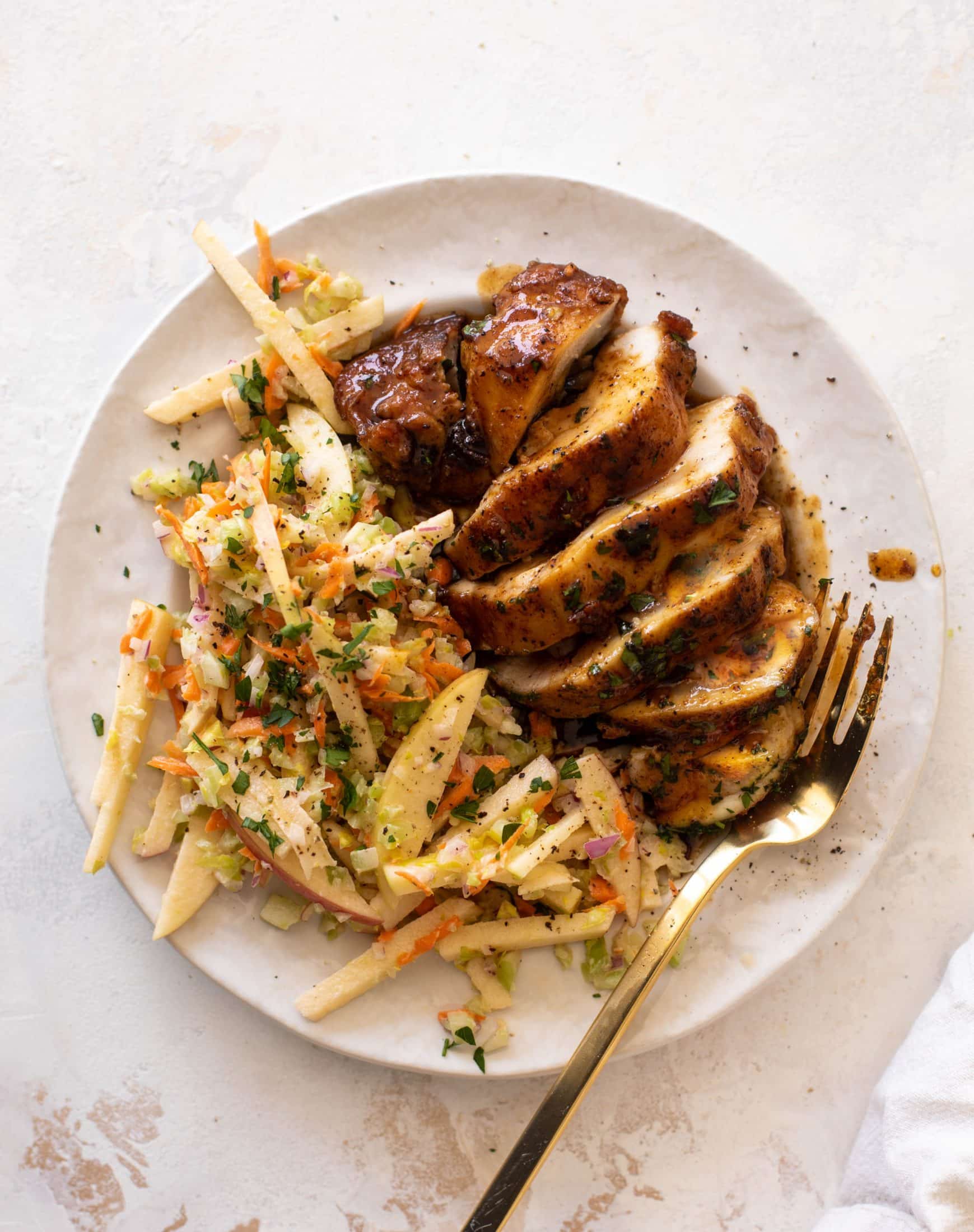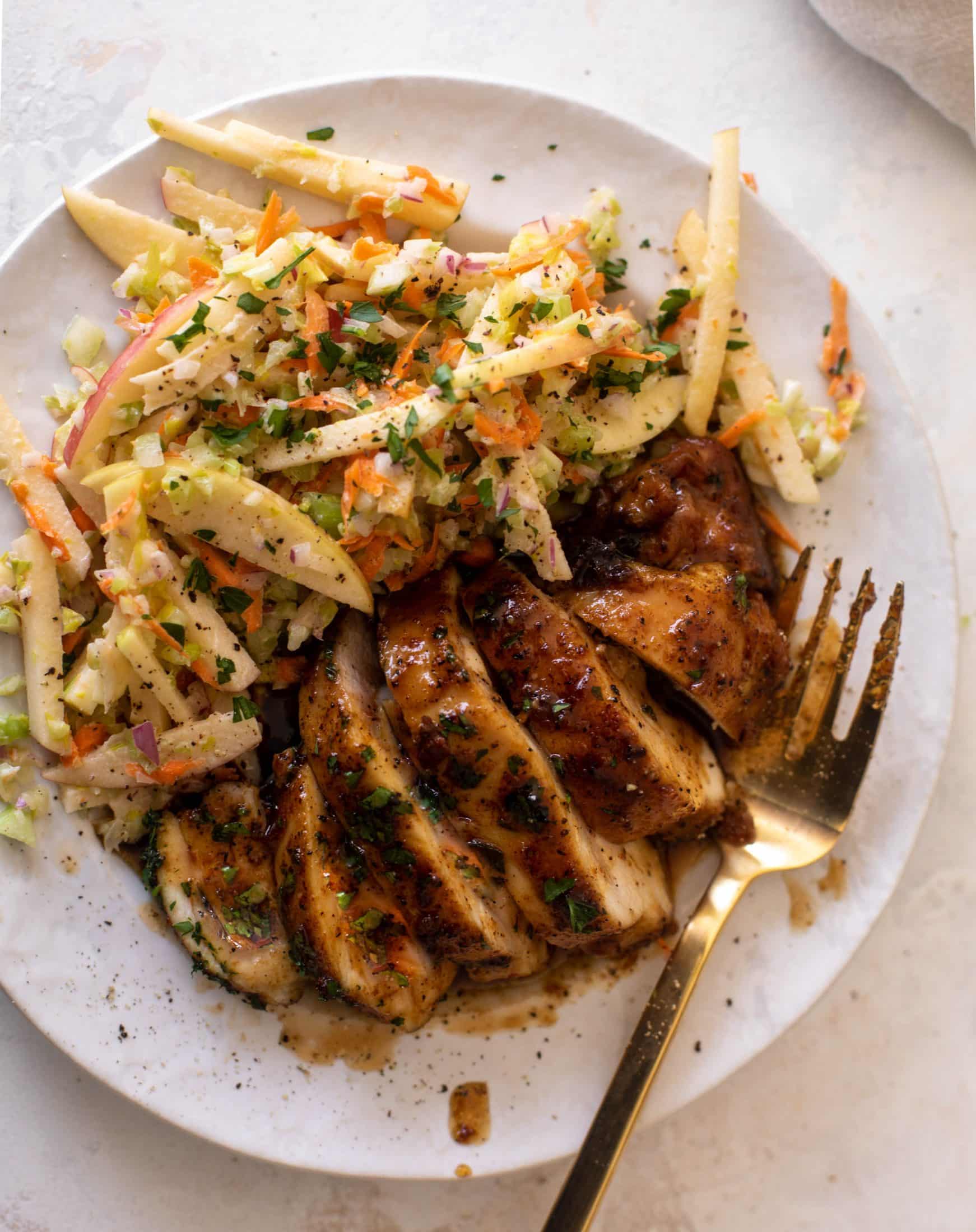 This sticky apple cider chicken is tender and flavorful. It complements the cold, refreshing crunchy slaw in the best way – the combo is wonderful! It’s light and easy but very filling. I love when a satisfying meal is simple and fantastic!