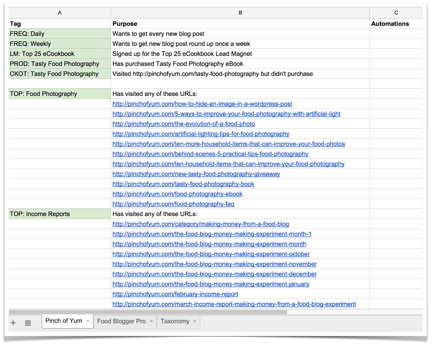 Let’s take the TOP: Food Photography tag as an example. What we’re saying with this tag is that anyone that subscribers to a POY or FBP list that visits one of the Pinch of Yum food photography posts will be assigned the TOP: Food Photography tag.