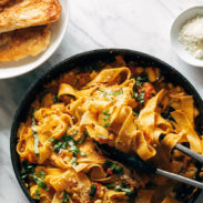 Pinch of yum is one of my favorite sites for recipes and this is my first rating … Because wow! This was delicious- so fresh with the lemon, basil, and veggies and then rounded out by the creamy sauce and salty Parm. I had left over chicken cutlets that I reheated in a pan and they worked perfect. I will definitely be making this again before the summer is over.