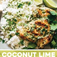 Coconut Lime Grilled Chicken Bowls! Grilled marinated chicken, fluffy rice, and excessive handfuls of mint and cilantro, finished off with a generous drizzling of big and flavorful creamy coconut lime sauce.