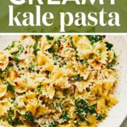 This Creamy Kale Pasta is fresh, easy, and DELICIOUS. Chewy bowtie pasta, coated in a light, salty, barely-creamy sauce, flecked with red pepper flakes and little bits of tender sautéed garlic kale.