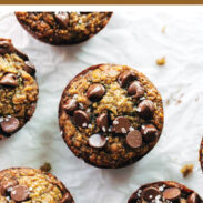 Chocolate chips contain refined sugar, which maybe isn’t a big deal if you have, like, 7 of them on top of the muffin. But if you are trying to keep these COMPLETELY refined sugar free, be sure to skip the chocolate chips on top and opt for cacao nibs, toasted coconut, or chopped nuts instead.