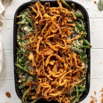 Raise your hand if you love green bean casserole! These crunchy green beans are blanketed in a creamy parmesan mushroom sauce and showered with...
