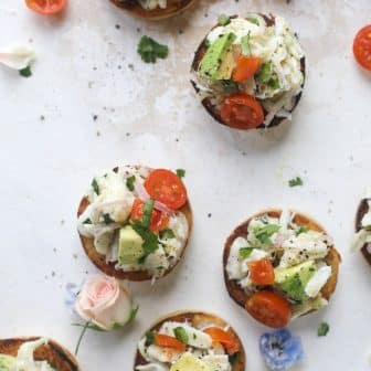 So this is how we make the most adorable crab salad toasts! I mean, is there anything cuter? Lunch just got REAL good.