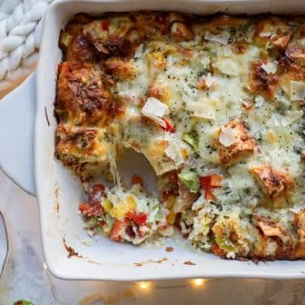 I have finally joined the breakfast strata club! This isn’t just any breakfast strata though. It’s a PEPPERONI ROLL breakfast strata. I KNOW.