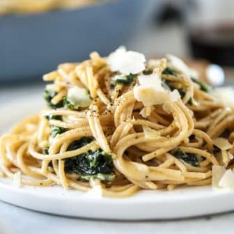 Meet my newest love: kale cacio e pepe! Or… kale, cheese and pepper. And pasta. What we have here is theeeee easiest weeknight meatless...