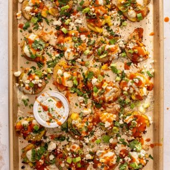 These crispy buffalo smashed potatoes are out of this world! My crispy smashed potatoes are topped with melty blue cheese, drizzled with buffalo wing...