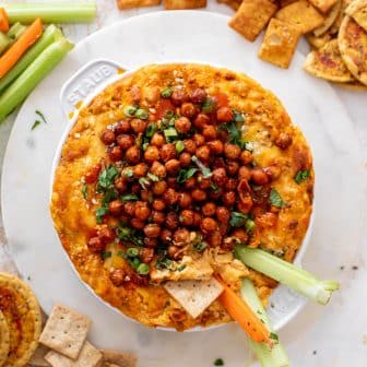 This buffalo chickpea dip is a spin on the classic buffalo chicken dip, but with garbanzo beans instead! So much cheesy flavor, some ranch...